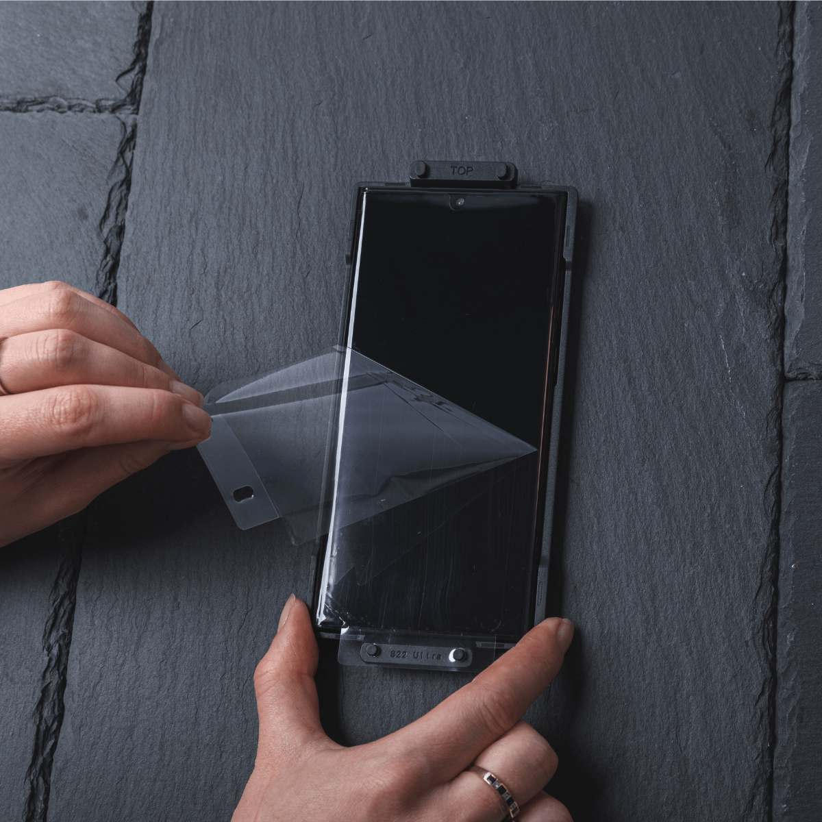 Carefully peel off the top layer using the screen protector tabs.