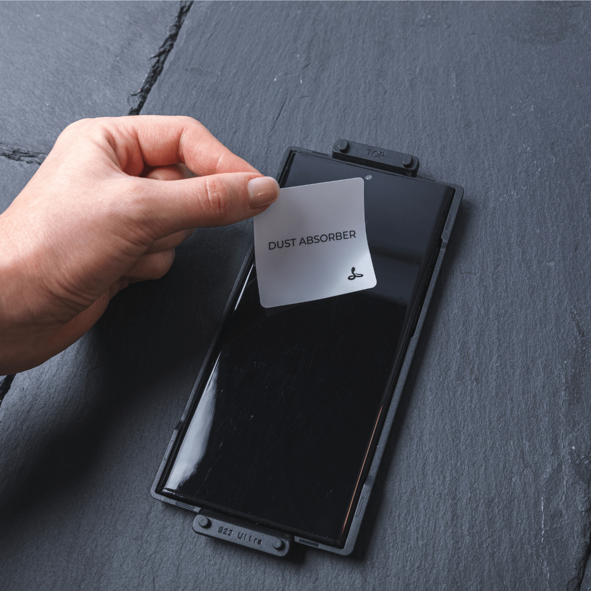 Blot the screen with the Dust Absorber to remove any dust particles.